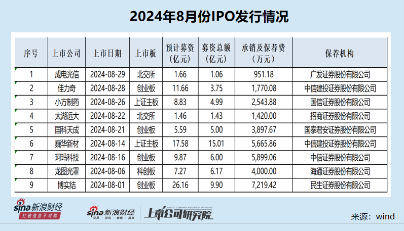 wind显示,8月份共有9家企业成功IPO,合计募资53.31亿元,较7月份的6家、44.43亿元的募资额都有增长。