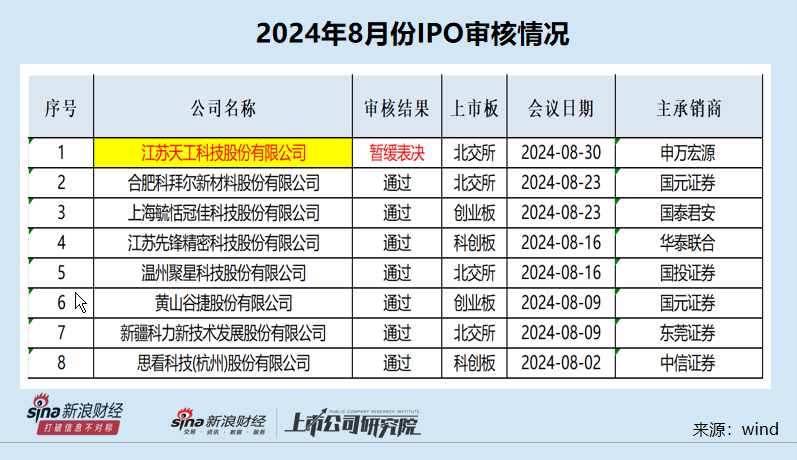 8月份,A股共有8家企业上会,7家过会,1家企业暂缓审议,名义过会率为87.5%。遭暂缓审议的企业是江苏天工科技股份有限公司(下称“天工股份”)。