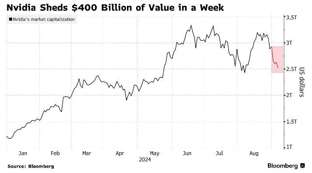 财联社9月7日讯(编辑 潇湘)作为华尔街眼中“地球上最重要的股票”,英伟达的市值在本周累计蒸发了约4060亿美元,这给美国股市带来了不小的压力。种种迹象表现,人们对美国经济健康状况及对人工智能交易可能已过度的担忧,正在迅速蔓延。