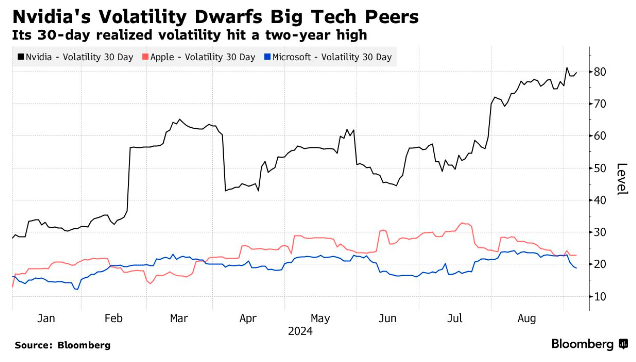 在过去两周里,这家全球领先的人工智能芯片制造商的市值已缩水了约五分之一。对于这一在过去两年几乎以一己之力引领美股涨势的科技巨头来说,最新的暴跌还凸显出了投资者面临的一个更紧迫的问题——如今,英伟达的波动性正令其他“七巨头”同行相形见绌,甚至对比之下,比特币看起来都像是一个平静的港湾。