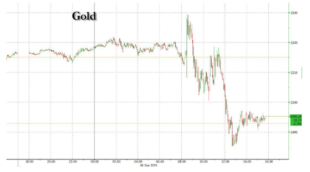 黄金也未能幸免,就业数据出炉后短暂创下历史新高,随即又跌至盘中低点。
