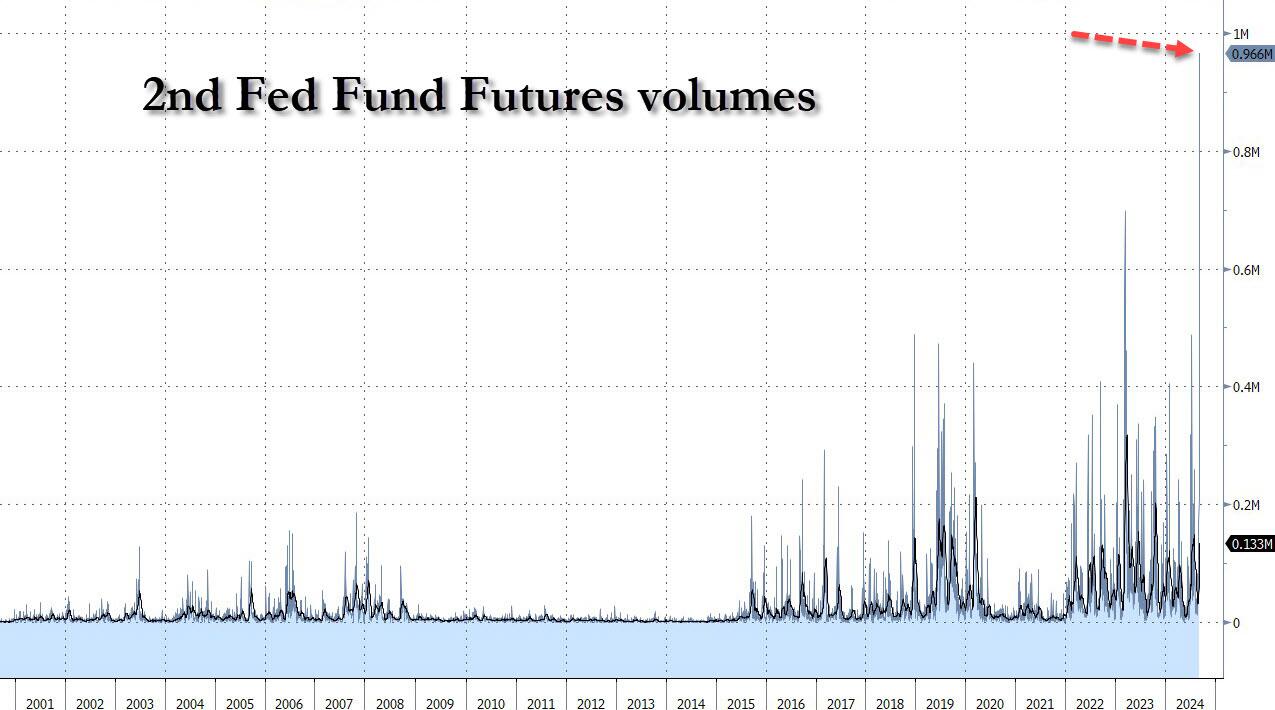 而市场押注在非农夜的频繁转变,也令得美国利率期货市场在昨夜出现了前所未有的一幕:仅仅截止北京时间周六凌晨1点,通常交投最活跃的到期日第二档的美国联邦基金期货合约成交量就达到了90万份,创下了1988年出现这一交易品种以来任何合约的单日成交最高纪录。
