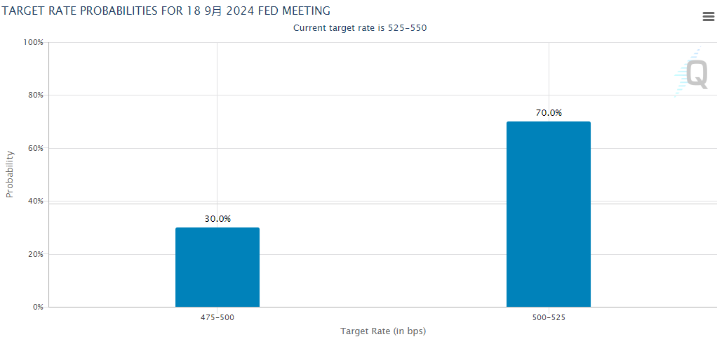 根据芝商所的美联储观察工具显示,截止本周五收盘,市场交易员对美联储本月降息25个基点的概率预期为70%,降息50个基点的概率预期则为30%。