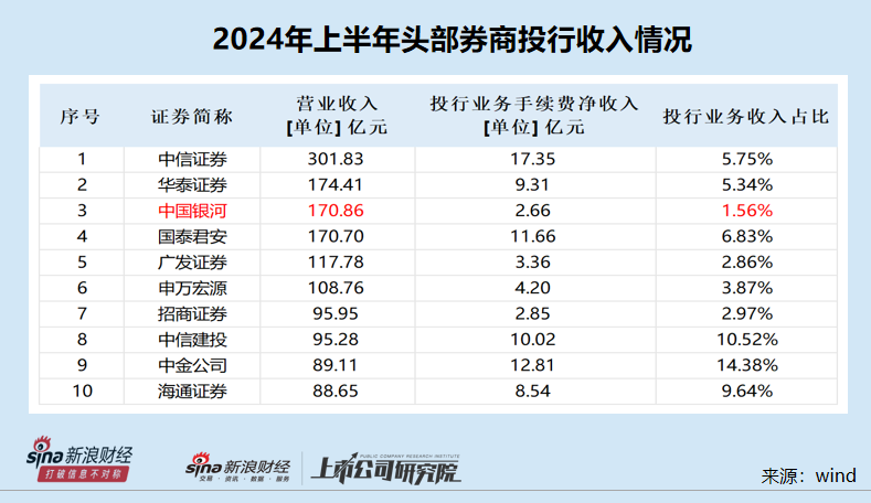 2024年上半年,营收排名前十的券商分别是中信证券华泰证券、中国银河、国泰君安、广发证券、申万宏源、招商证券、中信建投、中金公司、海通证券,投资银行手续费净收入占当期总营收的比例分别为5.75%、5.34%、1.56%、6.83%、2.86%、3.87%、2.97%、10.52%、14.38%、9.64%,中国银河的占比显著偏低,排名垫底。